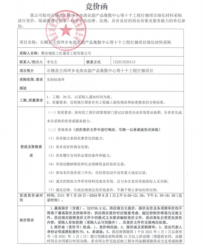 附件:石棉縣王崗坪鄉(xiāng)電商農(nóng)副產(chǎn)品集散中心等十個工程打捆項目綠化材料競價函