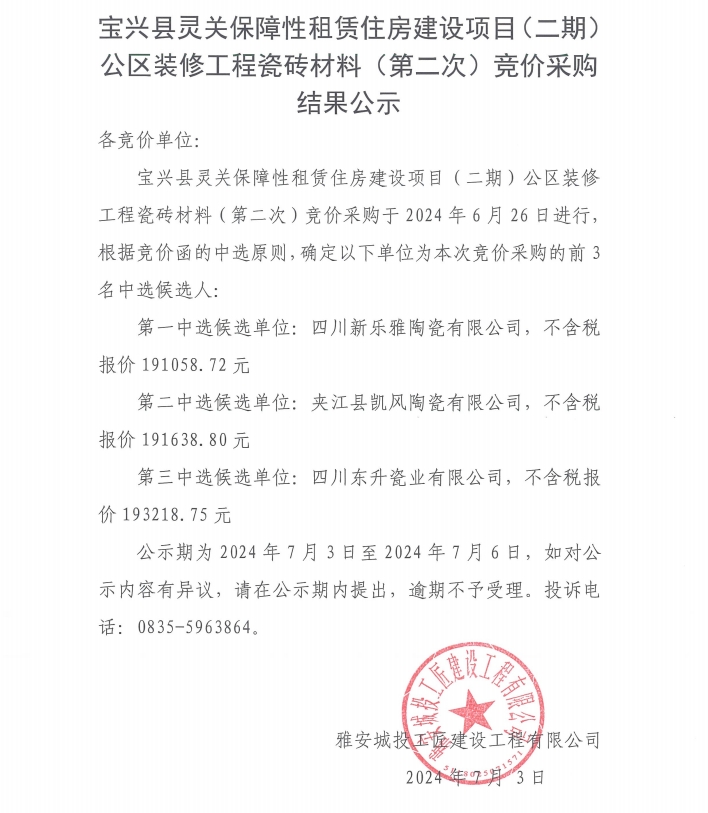 寶興縣靈關(guān)保障性租賃住房建設(shè)項(xiàng)目(二期)公區(qū)裝修工程瓷磚材料(第二次)競(jìng)價(jià)采購(gòu)結(jié)果公示)