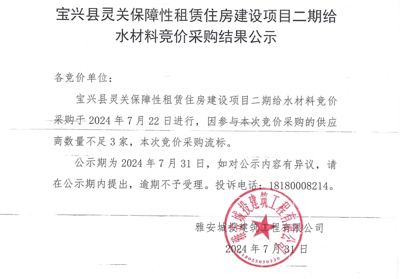 寶興縣靈關(guān)保障性租賃住房建設(shè)二期給水材料競(jìng)價(jià)采購結(jié)果公示