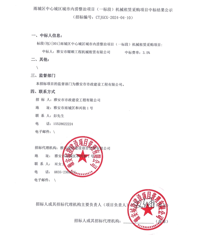 雨城區(qū)中心城區(qū)城市內(nèi)澇整治項目(一標段)機械租賃采購項目中標結(jié)果公示