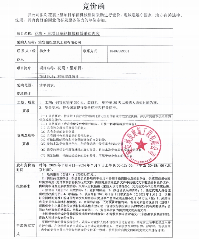 花襄·里項目車輛機械租賃采購競價公告