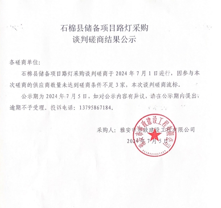 石棉縣儲備項(xiàng)目路燈采購談判磋商結(jié)果公示