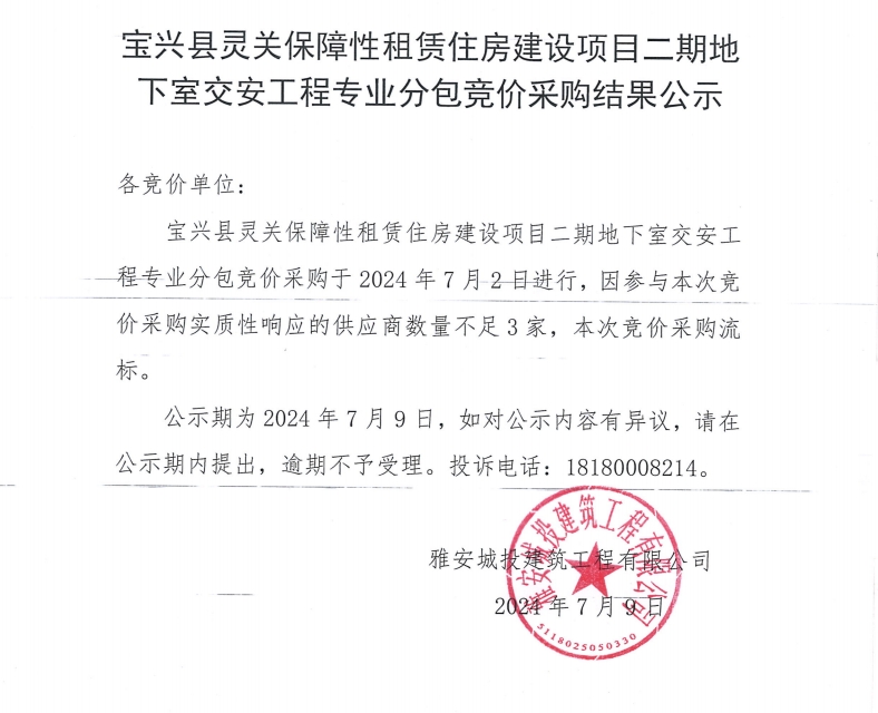 寶興縣靈關(guān)保障性租賃住房建設(shè)項(xiàng)目二期地下室交安工程專業(yè)分包競價采購結(jié)果公示
