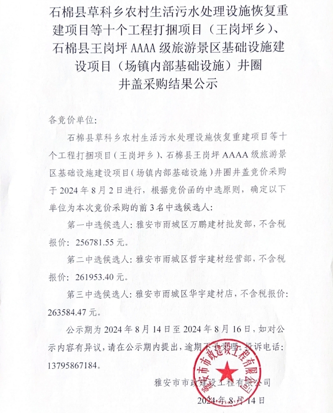 石棉縣草科鄉(xiāng)農(nóng)村生活污水處理設(shè)施恢復(fù)重建項(xiàng)目等十個(gè)工程打捆項(xiàng)目(王崗坪鄉(xiāng))、石棉縣王崗坪AAAA級(jí)旅游景區(qū)基礎(chǔ)設(shè)施建設(shè)項(xiàng)目(場鎮(zhèn)內(nèi)部基礎(chǔ)設(shè)施)井圈井蓋采購結(jié)果公示