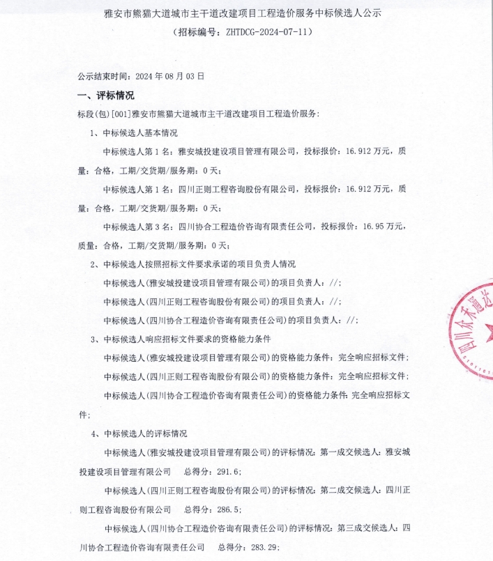 雅安市熊貓大道城市主干道改建項(xiàng)目工程造價(jià)服務(wù)中標(biāo)候選人公示