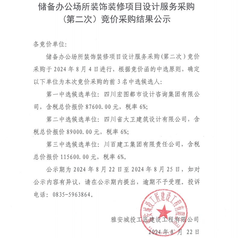 儲(chǔ)備辦公場(chǎng)所裝飾裝修項(xiàng)目設(shè)計(jì)服務(wù)采購(gòu)(第二次)競(jìng)價(jià)采購(gòu)結(jié)果公示