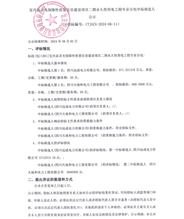 寶興縣靈關(guān)保障性租賃住房建設(shè)項(xiàng)目二期永久性用電工程專業(yè)分包中標(biāo)候選人公示