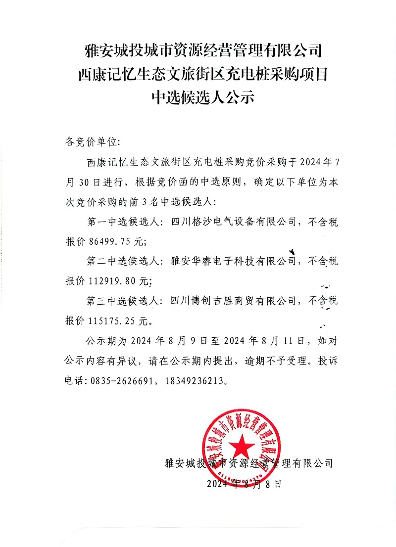 雅安城投城市資源經(jīng)營管理有限公司西康記憶生態(tài)文旅街區(qū)充電樁采購項目中選候選人公示