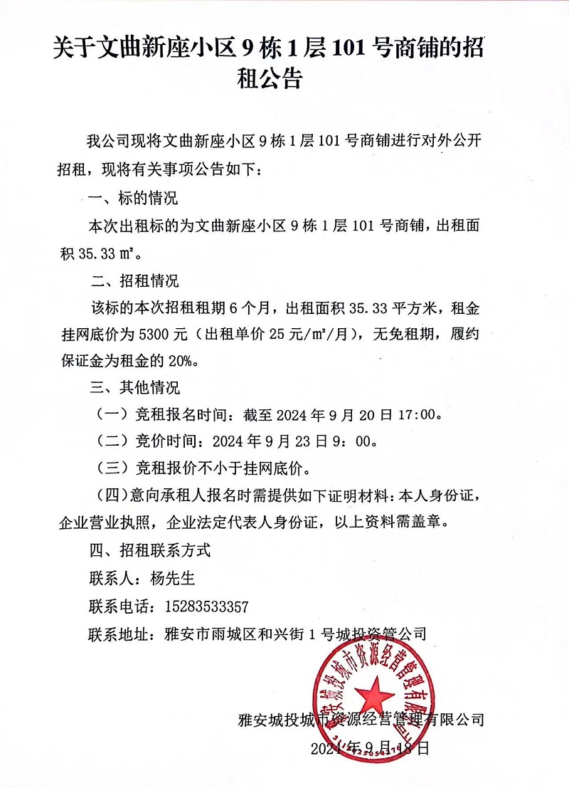 關(guān)于文曲新座小區(qū)9棟1層101號(hào)商鋪的招租公告