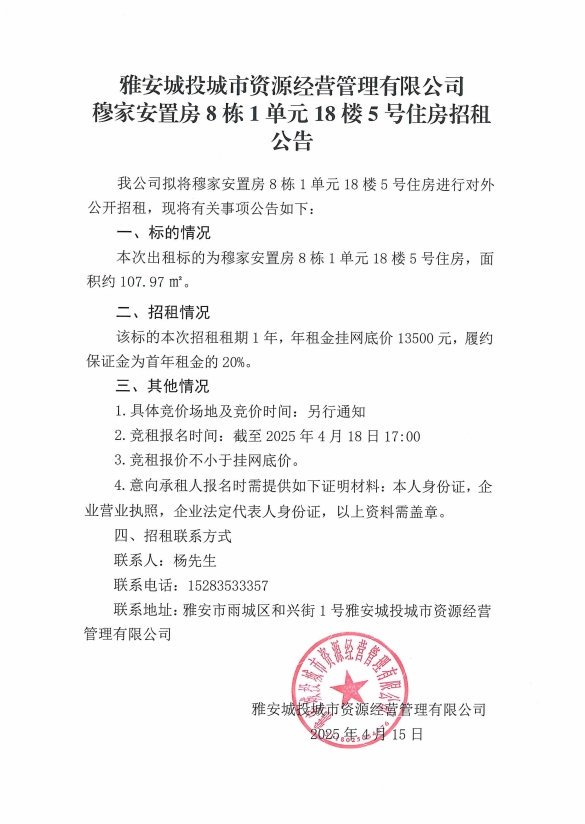 雅安城投城市資源經(jīng)營管理有限公司穆家安置房8棟1單元18樓5號住房招租公告