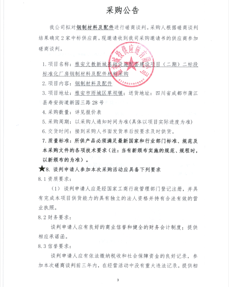 雅安文教新城基礎(chǔ)設(shè)施配套建設(shè)項(xiàng)目(二期)二標(biāo)段標(biāo)準(zhǔn)化廠房鋼制材料及配件材料采購(gòu)公告
