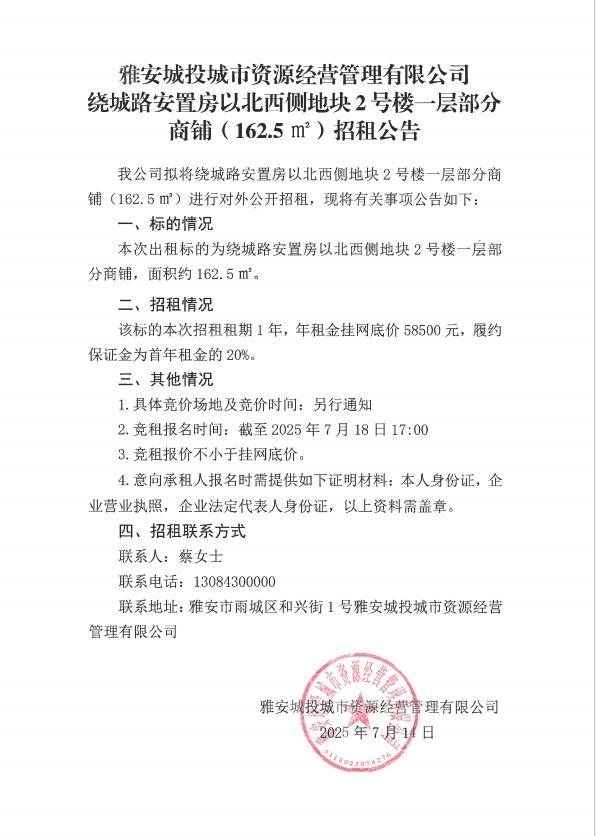 繞城路安置房以北西側地塊2號樓一層部分商鋪(162.5㎡)招租公告