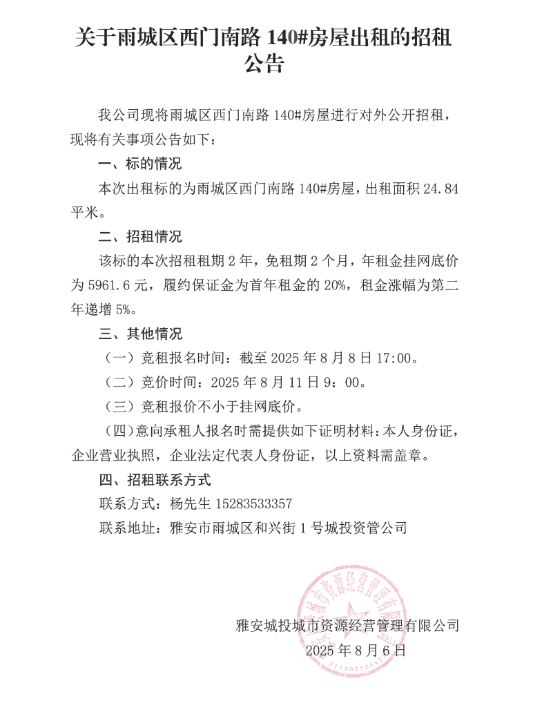 關(guān)于雨城區(qū)西門南路140#房屋出租的招租公告