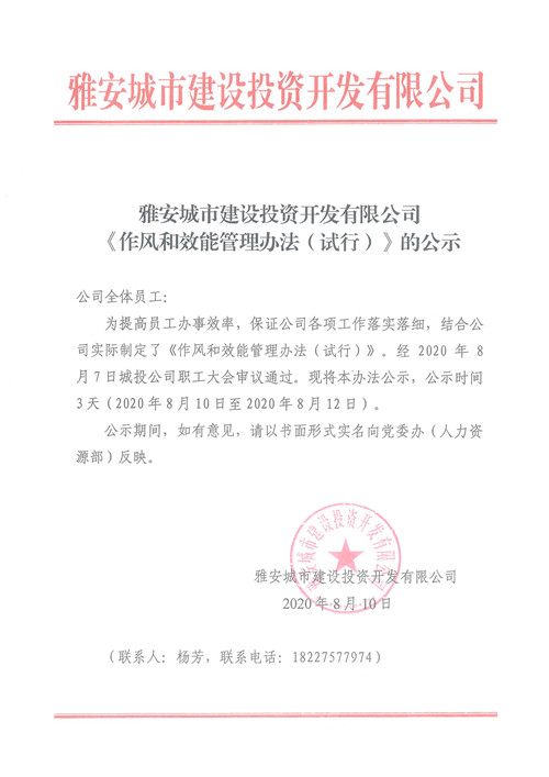 雅安城市建設投資開發(fā)有限公司《作風和效能管理辦法(試行)》的公示