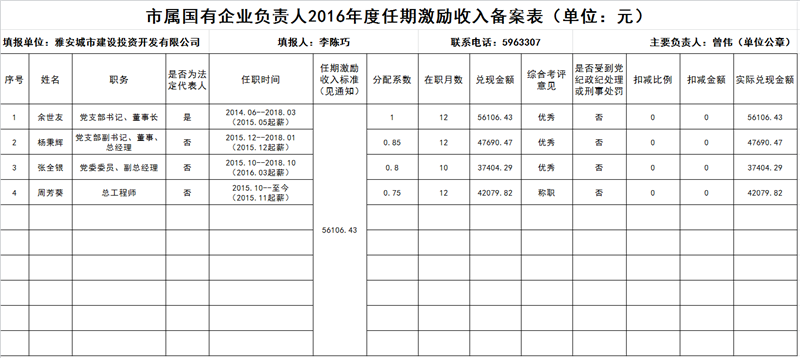 市屬國(guó)有企業(yè)負(fù)責(zé)人2016年度任期激勵(lì)收入備案表