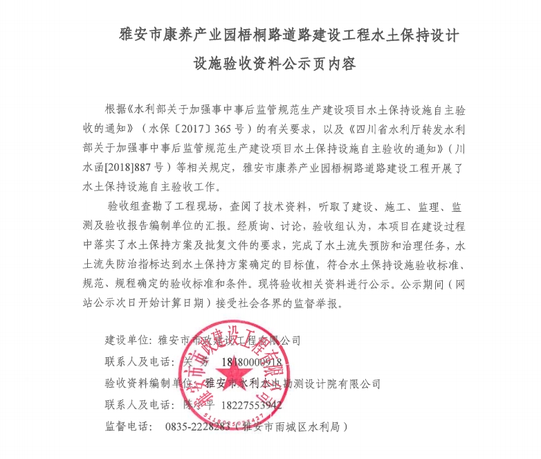 雅安市康養(yǎng)產(chǎn)業(yè)園梧桐路道路建設(shè)工程水土保持設(shè)計設(shè)施驗收資料公示頁內(nèi)容