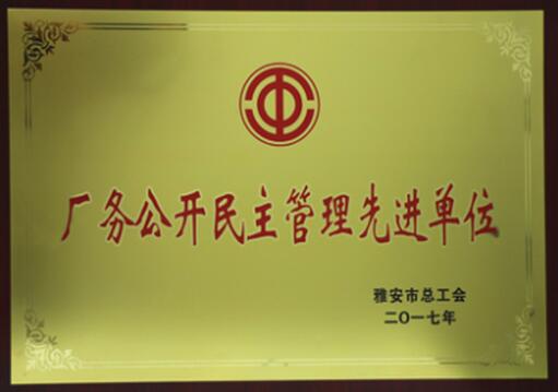 2017年7月 我公司被評為“全市廠務(wù)公開民主管理先進單位”
